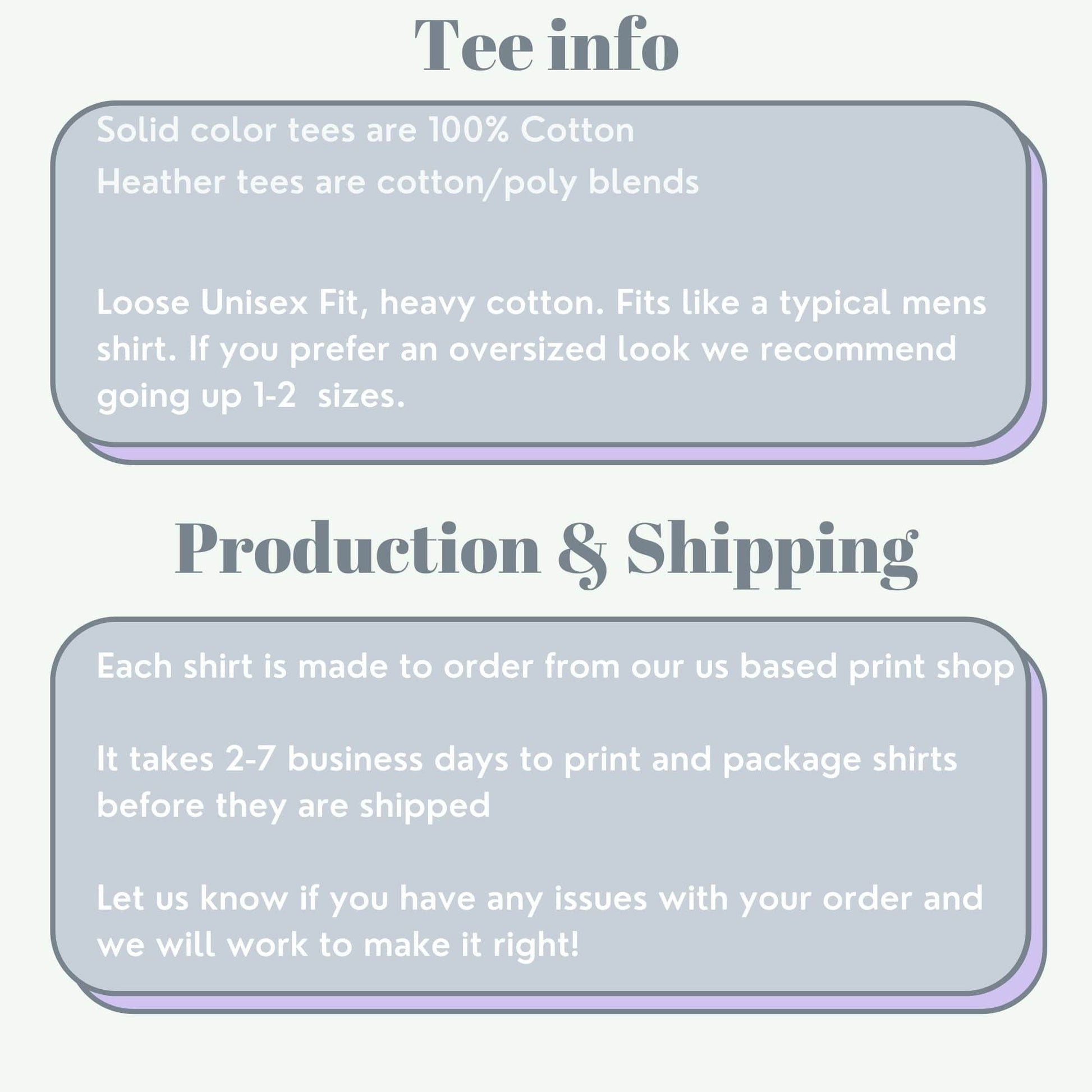Each tshirt is printed on demand and has a processing time of 2-7 Business Days