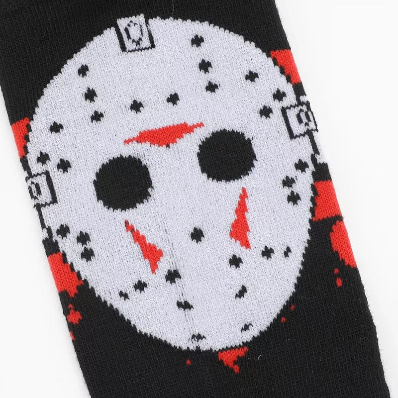 Women's knee high socks feature a custom design inspired by Friday the 13th and featuring Jason Voorhees' iconic hockey masks just below the knees.